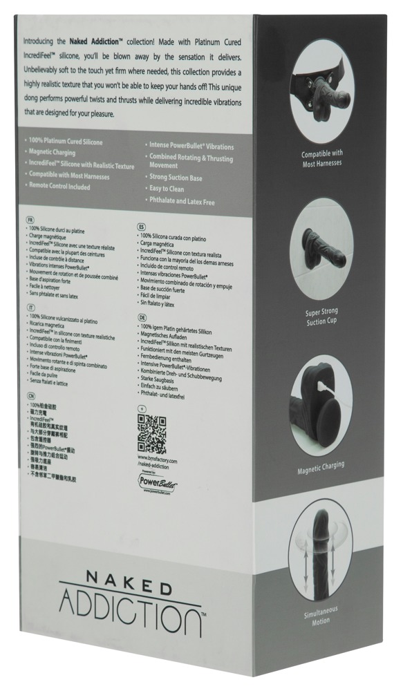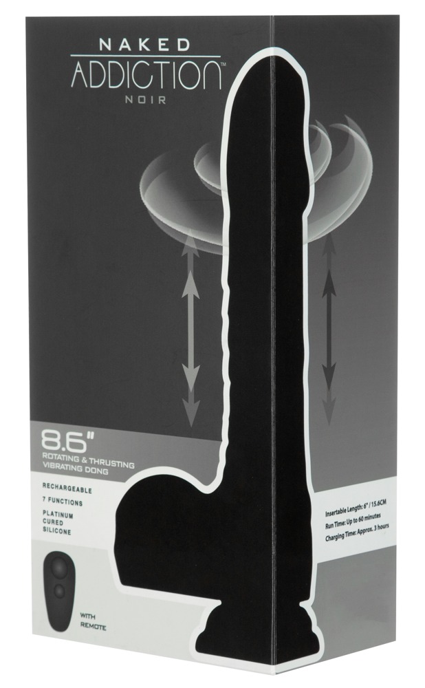 Flexibele stuwende vibrator 8,6" Rotating & Thrusting Vibrating Dong van Naked Addiction met roterende top. In levensechte penislook met fijne adering en uitpuilende eikel. Met zuigvoet onder de grijpgrage testikels die stevig vastplakt op elk glad oppervlak voor handsfree plezier. De vibrator is ook compatibel met strap-ons en urinalen.