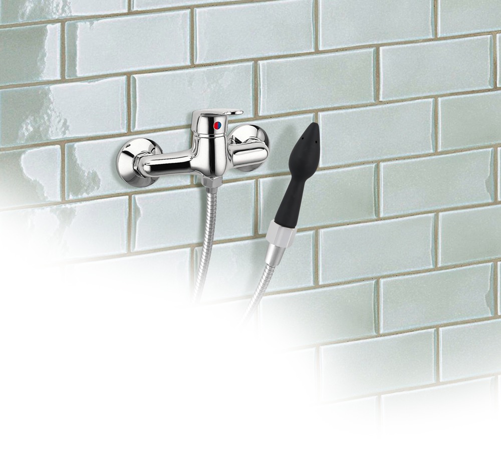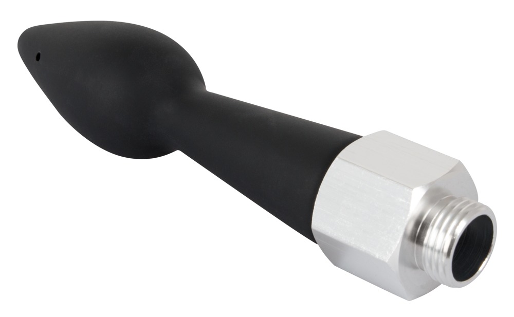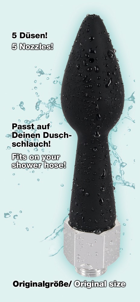 Schroef gewoon het schroefdraad van de intieme douche op een doucheslang en je bent klaar om te gaan: Het fluweelzachte oppervlak van de kegelvormige plug van zwarte silicone glijdt langzaam naar zijn bestemming voor intieme reiniging. Afhankelijk van de intensiteit van de douchestraal spuit er water uit vijf gaten, waarvan één in het uiteinde van de plug.