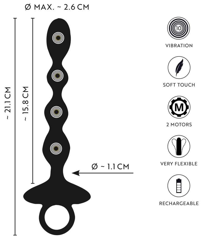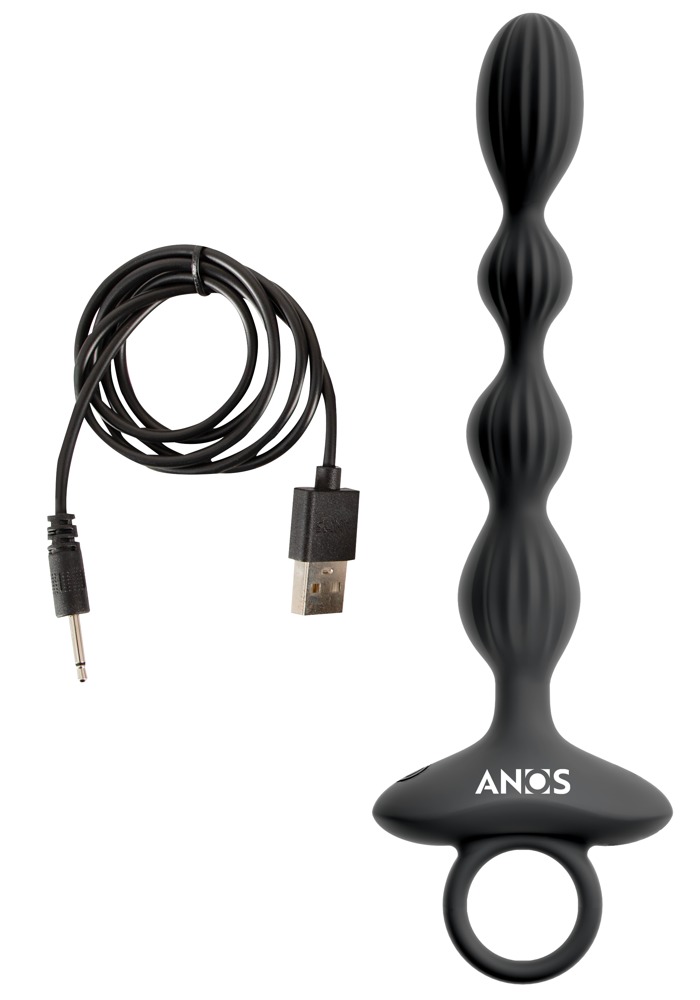 Flexibele Anaal Kralen met Springende Trillingen van ANOS voor diep, intens achterdeurplezier. De flexibele anaal kralen stimuleren met 4 vibrerende kralen met groefstructuur. Twee motoren zorgen voor 10 krachtige vibratiestanden die je gemakkelijk kunt bedienen met één druk op de knop. Er is ook een speciale stand voor springende vibraties, waarbij de pulsen van de ene vibro-bullet naar de volgende springen. Voor spannende verrassingseffecten tijdens anaal spel!
