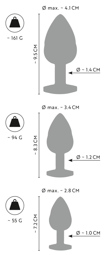 Metalen Butt Plug Set met Diamanten van ANOS met 3 metalen pluggen in verschillende maten en gewichten. Voor anale stimulatie en perfecte rektraining. Elke plug siert de anus met een verschillend gekleurde edelsteen op de anaalveilige stop. De rondom spiraal geribbelde metalen pluggen kunnen ook verwarmd of gekoeld worden voor temperatuurspelletjes.