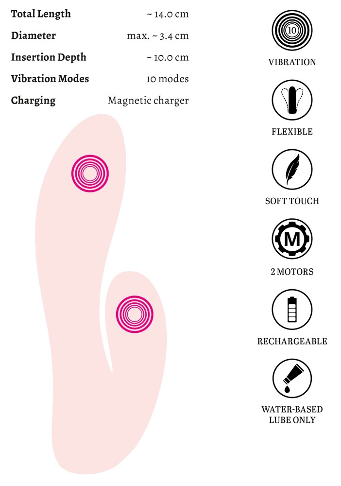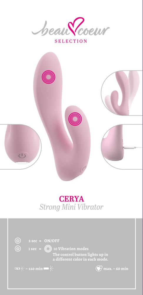 De sensueel gebogen CERYA Strong minivibrator van beau cœur verwent met zijn twee armen tegelijkertijd de vagina en de clitoris. Zijn extra krachtige vibraties gaan echt diep, onder de huid en recht op het doel af. Met 10 verschillende vibratiestanden is er voor elke stemming en elk hoogtepunt de juiste snelheid. Druk gewoon op de knop. Het perfecte speeltje om kennis te maken met dubbele stimulatie en meerdere orgasmes!