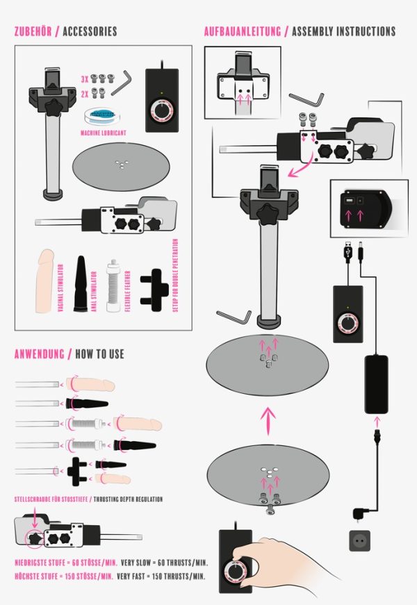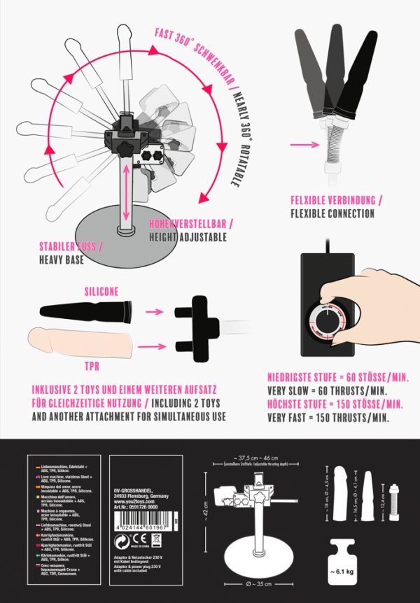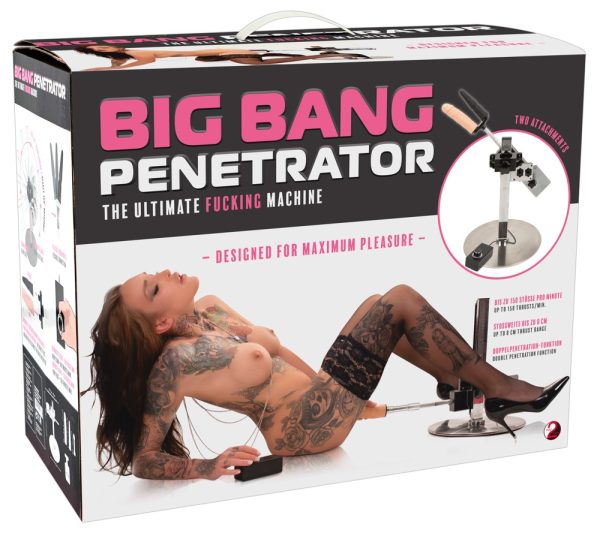 Big Bang Penetrator seksmachine met in hoogte verstelbare standaard en twee opzetstukken. Verstelbaar met de afstandsbediening en draaibaar tot bijna 360°. De traploze stuwkrachtregeling levert tot 150 stoten per minuut en de stuwkrachtdiepte kan worden ingesteld tot 8 cm. Ontworpen voor handsfree bediening en met een slank, modern ontwerp voor maximaal gebruik. kabellengte van 1,5 meter met SchuKo type F stekker. Inclusief insteekhulpstuk voor dubbele penetratie.