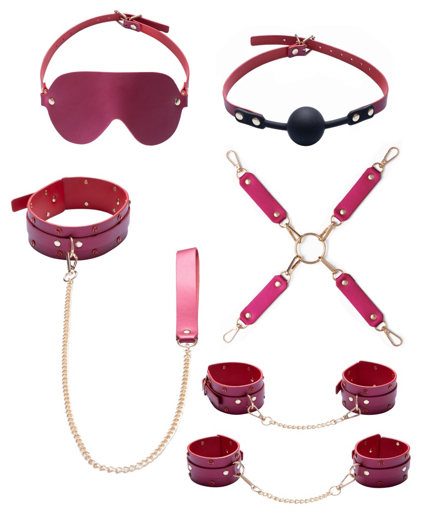 6-delige bondageset van Bad Kitty gemaakt van fijn, roze imitatieleer in een verfijnde parelmoer-look. Goudkleurig beslag en kettingen en fonkelende strass-steentjes onderstrepen de trendy glamour-look. Een stijlvolle bondageset voor nieuwsgierigen en kenners: compleet met leiband, oogmasker en knevel voor veelzijdige speelsheid ver weg van het alledaagse. De comfortabele hoofdbanden en boeien kunnen snel worden omgedaan met gespen en op maat worden gemaakt, terwijl de kettingen met karabijnhaken allemaal afneembaar zijn.