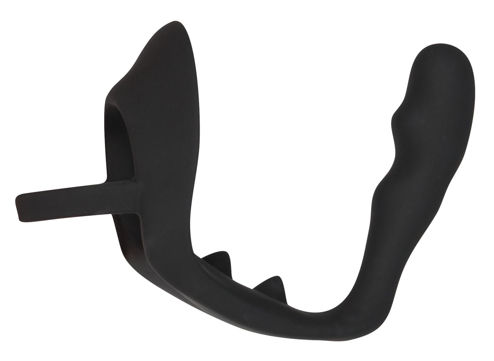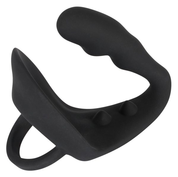 Deze zwarte penis/scrotum ring scoort niet alleen met een extra anaalplug, maar ook met een heerlijk knobbelig perineum bruggetje. Puur plezier!