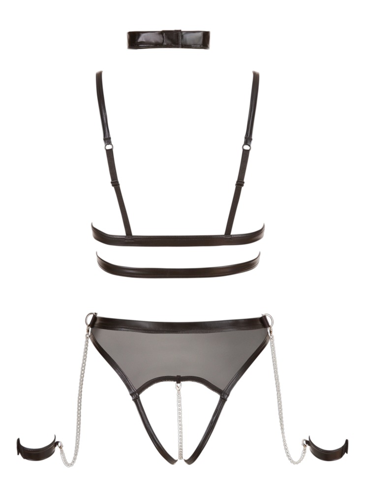 Ouvert jarretelle body van Cottelli BONDAGE in harnas-look gemaakt van fijn powernet met spannende wetlook details. Splitjes in de cups met drukknopen om te openen. Het volledig open kruis heeft een verwijderbare, stimulerende kruisband. De bijgevoegde zachte enkelbanden voor de handen met hun karabijnhaakkettingen (elk 28 cm lang) kunnen gemakkelijk aan de zijringen van de tailleband worden gehaakt. Enkelbandjes met verstelbare klittenbandsluitingen. Bandjes en 2 jarretelbandjes verstelbaar aan de voorkant - jarretelbandjes ook afneembaar. Inclusief wetlook kraag met ring aan de voorkant, klittenbandsluiting aan de achterkant.
