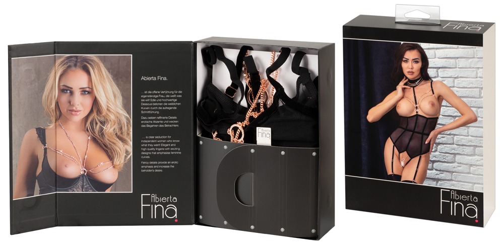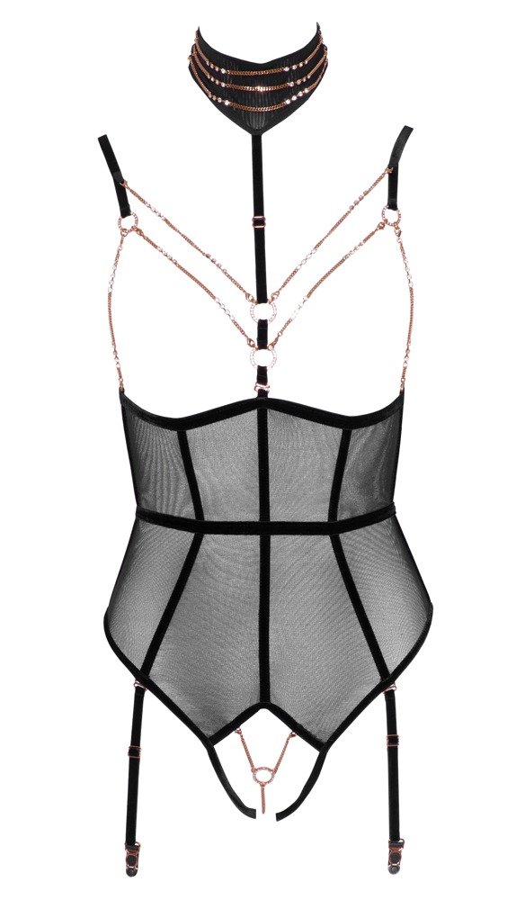 Busteloze bodysuit van Abierta Fina met volledig open kruis, vervaardigd uit powernet met elastische fluwelen strepen en roségoudkleurige juwelenelementen. Riemen en bretels verstelbaar, bretels ook afneembaar. Verstelbaar decolletériempje met ketting (met knoopsluiting) eveneens afneembaar, evenals de borstkettinkjes met kleine karabijnhaakjes en de kruisketting met sierring. Alle kettingen zijn bovendien versierd met kleine strassteentjes. Achteraanzicht in tweedelige look met twee clipsluitingen op bh en panty/strap tailleband.