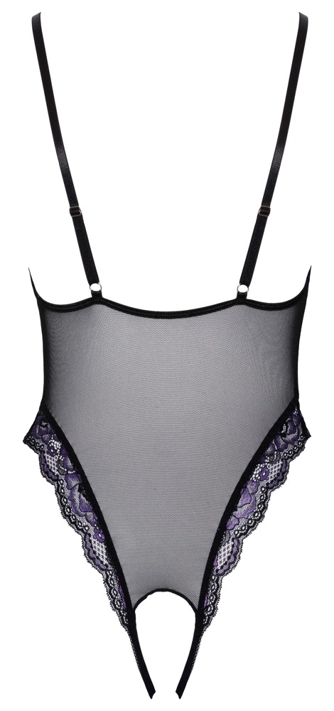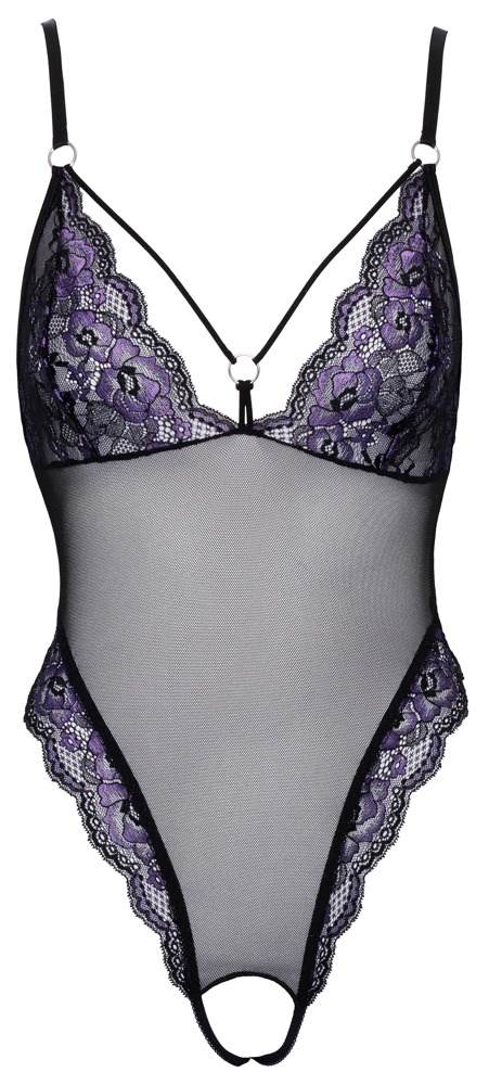 The beautiful body from Cottelli LINGERIE is made out of delicate powernet and floral lace in 2 colours. The floral lace is on the wireless cups and high legs. It is soft and stretchy which means that it is extremely comfortable to wear. There are stretchy straps, which are joined together by a ring, in the cleavage area. The straps are adjustable. There are two stretchy straps over the open crotch area.
