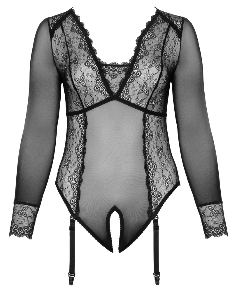 Zwart-transparante kruisloze body met lange mouwen van Cottelli CURVES van fijn powernet met inzetten van delicaat kant. Overal elastisch en zacht knuffelbaar voor een nauwsluitende pasvorm met het hoogste draagcomfort. Grote uitsnede aan de achterkant, clipsluiting aan de hals. Uitnodigend open bij het kruis tot boven de bodem. De twee bretels vooraan zijn verstelbaar en volledig afneembaar.