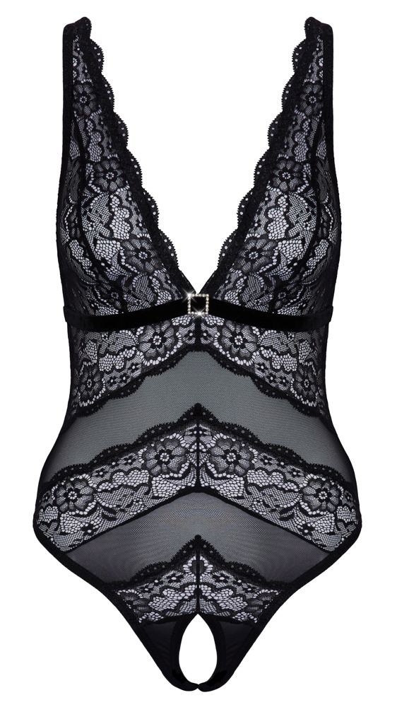 Elastische kruisloze body van Cottelli LINGERIE in een fijne zachte materiaalmix van powernet en bloemenkant. Mooie lage halslijn, een strass-element fonkelt eronder op de fluwelen onderbusteband. Het kruis is verleidelijk open. Powernet rug met verstelbare haaksluiting. De bandjes zijn ook verstelbaar voor een perfecte pasvorm.