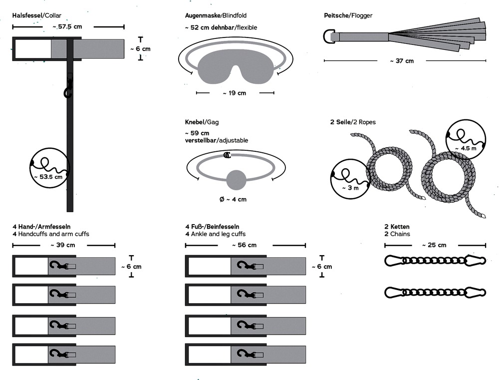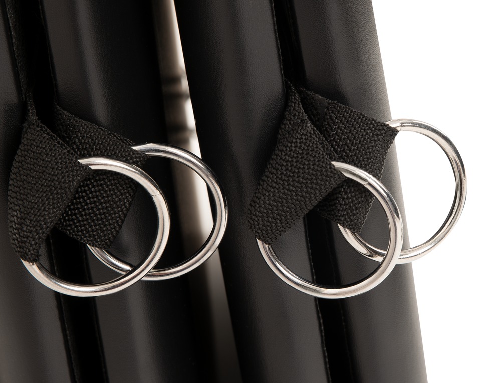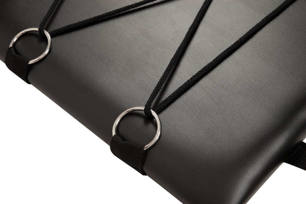 De snel in elkaar te zetten bondageplank heeft 8 ringen aan elke kant en 1 ring aan het hoofd- en voeteneind (ring-Ø 4,5 cm elk), waarin de bijgeleverde boeien snel en individueel kunnen worden vastgehaakt met hun karabijnhaken.