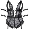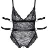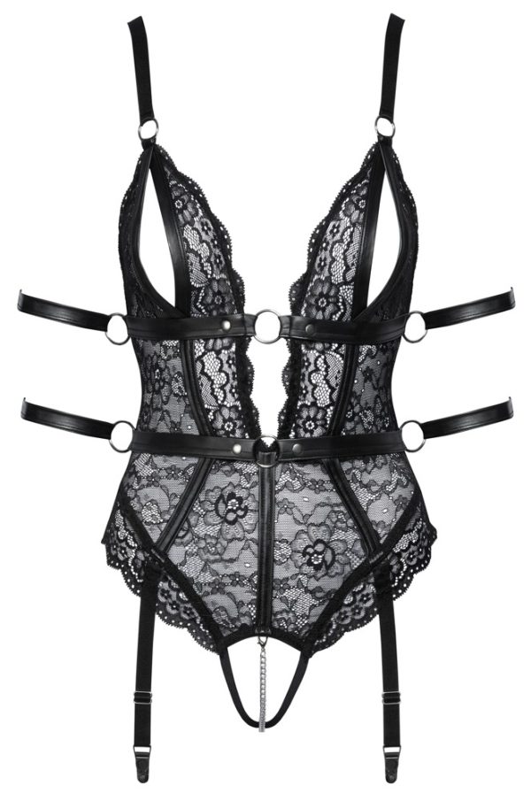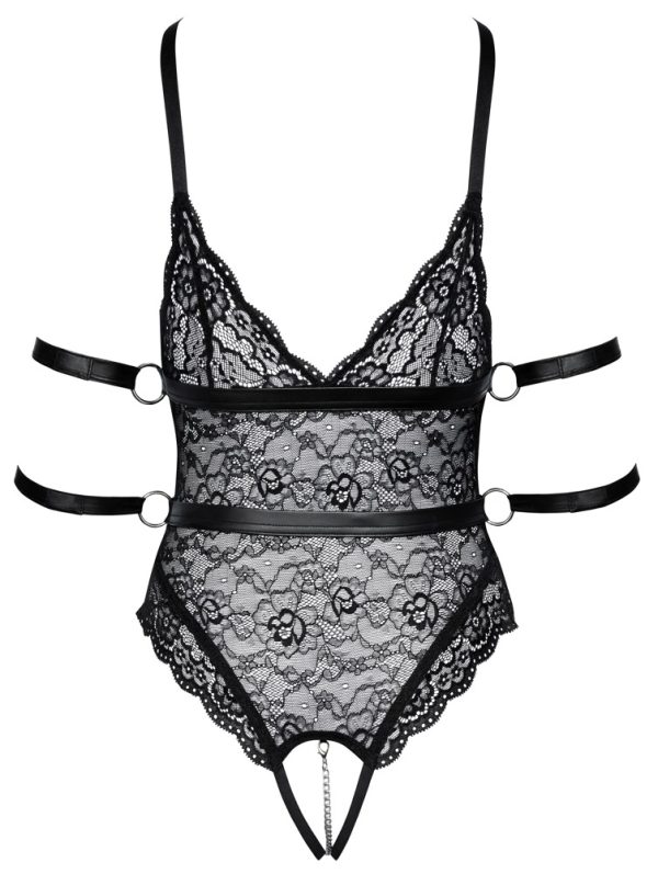 Oversized kanten body van Cottelli BONDAGE met 2 afneembare jarretelbandjes en 4 enkelbandjes. Gemaakt van zacht, rekbaar zwart kant met mat-look banddetails en zilverkleurige accessoires. Laag uitgesneden aan de voor- en achterkant. Zachte cups met verleidelijke splitjes. Verwijderbare, stimulerende ketting in het volledig open kruis. Riempjes genaaid onder de buste en in de taille met ringen aan de zijkanten waardoor de 4 ingesloten enkelboordjes getrokken kunnen worden. De zachte enkelbandjes kunnen snel aan- en uitgedaan worden met klittenband. De twee jarretelbandjes zijn verstelbaar en volledig afneembaar.