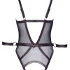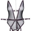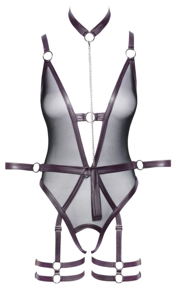 Mouwloze kruisloze body van Cottelli BONDAGE met een afneembaar enkelbandje. In een zwarte, rekbare, soepele matte look met kanten versieringen op de arm- en beenopeningen en zilverkleurige accessoires. Hooggesloten, met een bondage ring aan de voorkant van de opstaande kraag. Opwindend bustevrij (cut-outs) en met een afneembare, stimulerende ketting in het open kruis. Met een lange, zorgvuldig geïntegreerde 2-weg ritssluiting aan de achterkant. De ingesloten armmanchetten met karabijnkettingen kunnen met bondage-ringen aan de heupriem worden gehaakt. De riem en de zachte enkelboeien kunnen snel aan- en uitgedaan worden met hun verstelbare klittenbandsluitingen.