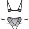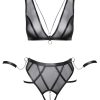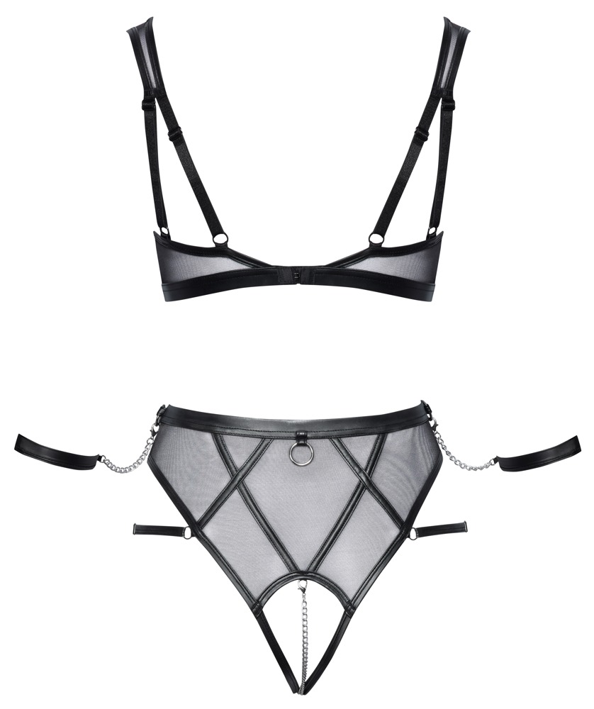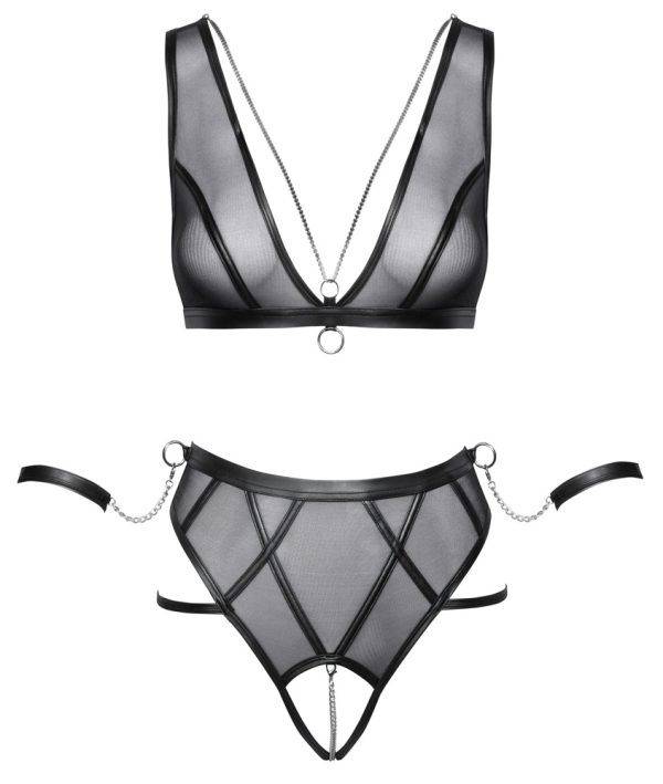 Zwarte set van Cottelli BONDAGE met een zachte beha, kruisloze tailleslip en twee zachte handboeien. Zacht, rekbaar powernet met matte details in bondagelook en zilverkleurige accessoires. Laag uitgesneden beha met afneembare sieradenketting in het decolleté. Onderbustebandje met enkelring aan de voorkant. De geraffineerde dubbele bandjes kunnen op maat worden versteld. Net als de haakjessluiting achter. High-waisted slip met een afneembare, stimulerende ketting bij het open kruis. De elastische bandjes aan de zijkanten kunnen op maat worden versteld. Aan de achterkant van de tailleband en aan elke kant zit een ring waarin de enkelboeien met hun karabijnkettingen kunnen worden vastgehaakt. De zachte enkelboeien kunnen snel aan- en uitgedaan worden met hun verstelbare klittenbandsluitingen.