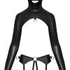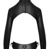 Korte hoofdmasker top en harnas string kruisloze set van Bad Kitty. De stijlvolle zwarte matte look voelt zacht en rekbaar aan naast de huid. Buik- en borstvrije top met lange mouwen en hoofdmasker. Met rits aan de achterkant. Het hele hoofd, de nek, schouders en armen zijn op een spannende manier bedekt. D-ring aan de voorkant. Masker met neusgaten en openingen voor ogen en mond. Lange mouwen met karabijnhaken aan het uiteinde. Ouvert string met aangehecht dijharnas. Met D-ringen aan de voorkant, zijkanten en achterkant voor het bevestigen van de mouwkarabijnhaken enz. De elastische, comfortabele jarretelbanden en riemen kunnen op maat worden versteld. Volledig open bij het kruis en over de bips.