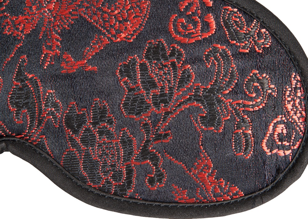 Set van zwart satijn met ingeweven motief: handboeien met klittenbandsluiting, oogmasker en 38 cm lange zweep met imitatieleren riemen.