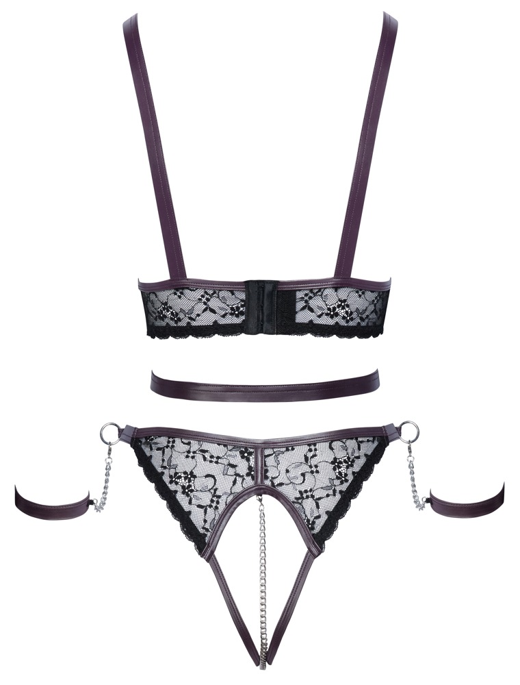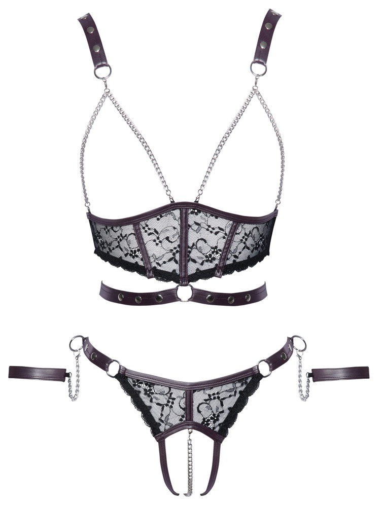 Ouvert setje van Cottelli BONDAGE met een bustebare top, kruisloze slip en twee zachte handboeien. Stijlvolle mix van fijn zwart kant met donkerpaarse matte look details en zilverkleurige accessoires. De top omlijst de blote borsten met kettingen. De tailleband op de voorste ring kan worden versteld met drukknopen, net als de bandjes. Verstelbare haaksluiting op de rug. Slipje met afneembare, stimulerende ketting in het open kruis. Verstelbare tailleband met drukknopen. De manchetten kunnen met hun karabijnkettingen in de zijringen van de tailleband worden gehaakt. De zachte enkelboeien kunnen snel aan- en uitgedaan worden met hun verstelbare klittenbandsluitingen.
