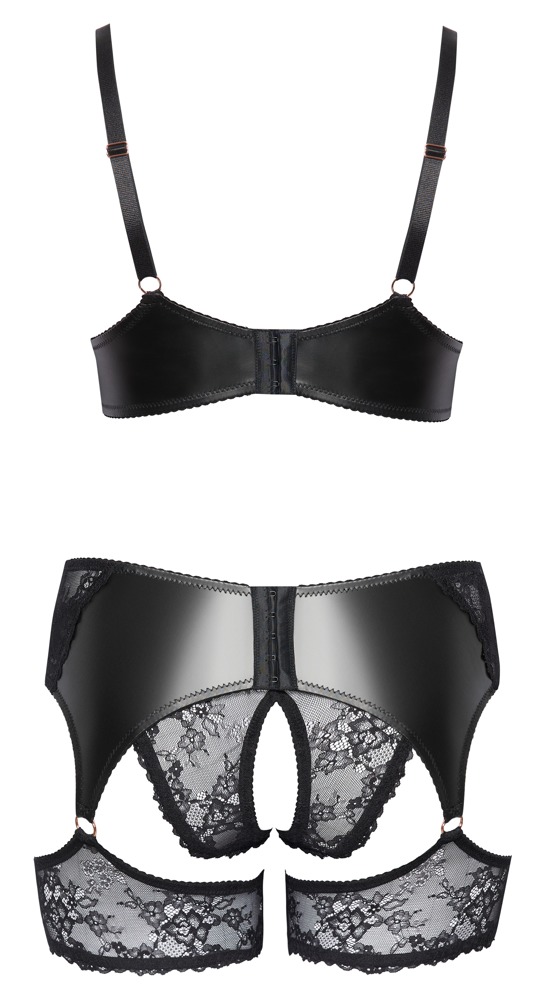 Zwart jarretelsetje van Cottelli CURVES met een bh, kruisloze slip en jarretelgordel met kousenband. Gemaakt van zacht elastisch kant met stretch inzetstukken voor een perfecte pasvorm en hoog draagcomfort. Roségoudkleurige accessoires maken de elegante look compleet. Bh met sieradenkettingen in het decolleté en hartjuwelenhangers tussen de zacht kanten cups. De bandjes en haaksluiting op de rug kunnen op maat worden versteld. Jarretelgordel met juwelenketting aan de voorkant. Verstelbare haaksluiting achter. De elastische kanten jarretelbandjes zijn met ringen aan de jarretelgordel bevestigd. De kanten slip verleidt met zijn open kruis.