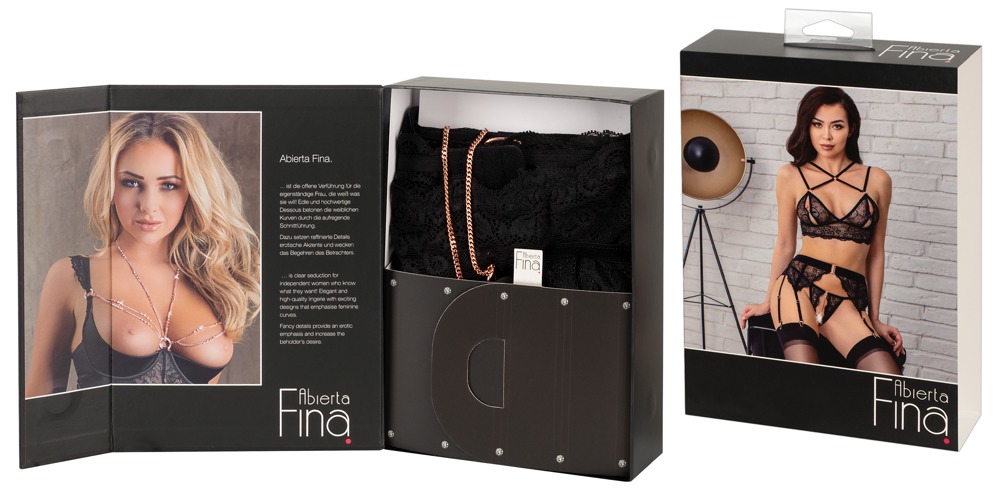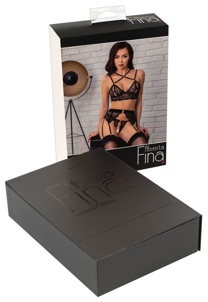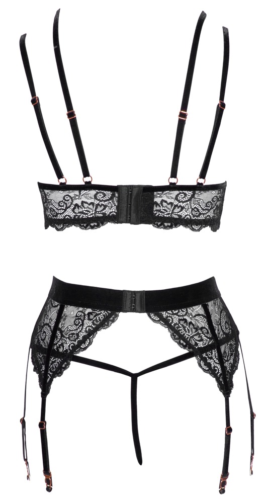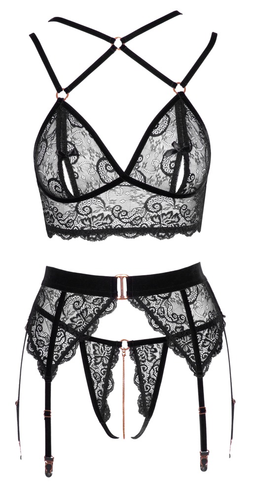 Beha, jarretelgordel en kruisloze string van Abierta Fina, vervaardigd van edel zwart stretchkant met fluwelen details en roségoudkleurige accessoires. De beha is langer uitgesneden en heeft kleine haaksluitingen onder de satijnen strikjes op de cups met split, er is ook een haaksluiting op de rug. De verstelbare fluwelen dubbele bandjes kruisen over het decolleté en lopen als 4-wegs bandjes aan de achterkant. De jarretelgordel heeft een fluwelen tailleband met decoratieve ring aan de voorkant en ook een haaksluiting aan de achterkant - de 6 jarretels zijn verstelbaar. De bijpassende string heeft een verwijderbare kruisketting in het volledig open kruis.