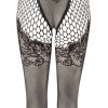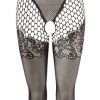 Zwarte catsuit met kantoptiek op de boezem en de dijen en open kruis. Naadloos. Elastische banden. Met voet. 90% polyamide, 10% elastaan.
