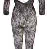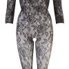 Prachtige catsuit van NO:XQSE in een zwarte kanten bloemenlook met 3/4 mouwen, lange pijpen en voet. Met geweven vetersluiting op de rug. Open bij het kruis. Naadloos gemaakt.
