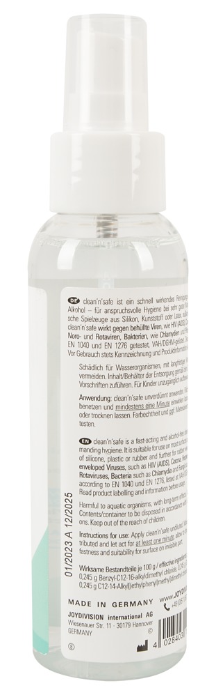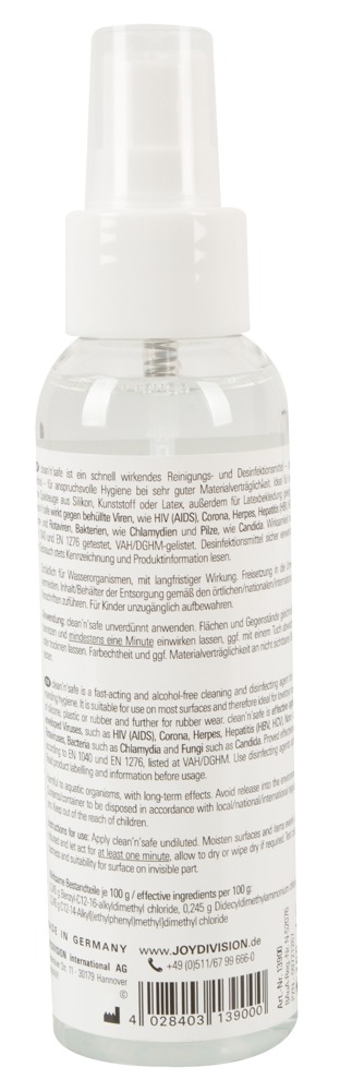 Universele toy cleaner clean'n'safe voor alle soorten erotische speeltjes. Kan gebruikt worden op materialen van rubber en latex, siliconen, PVC en plastic. Alcoholvrij, eiwitoplossend. Parfumvrij. Dermatologisch getest. 100 ml.