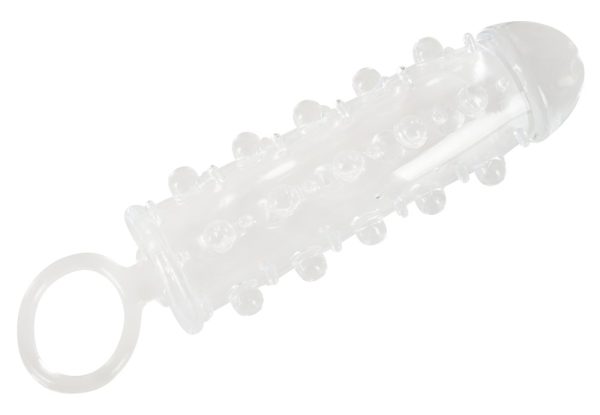 Transparante, zijdezachte penisschede van Crystal Clear met 2 cm verlenging, stimulerende nopjes en testikelring. Ook geschikt voor dildo en vibrator.