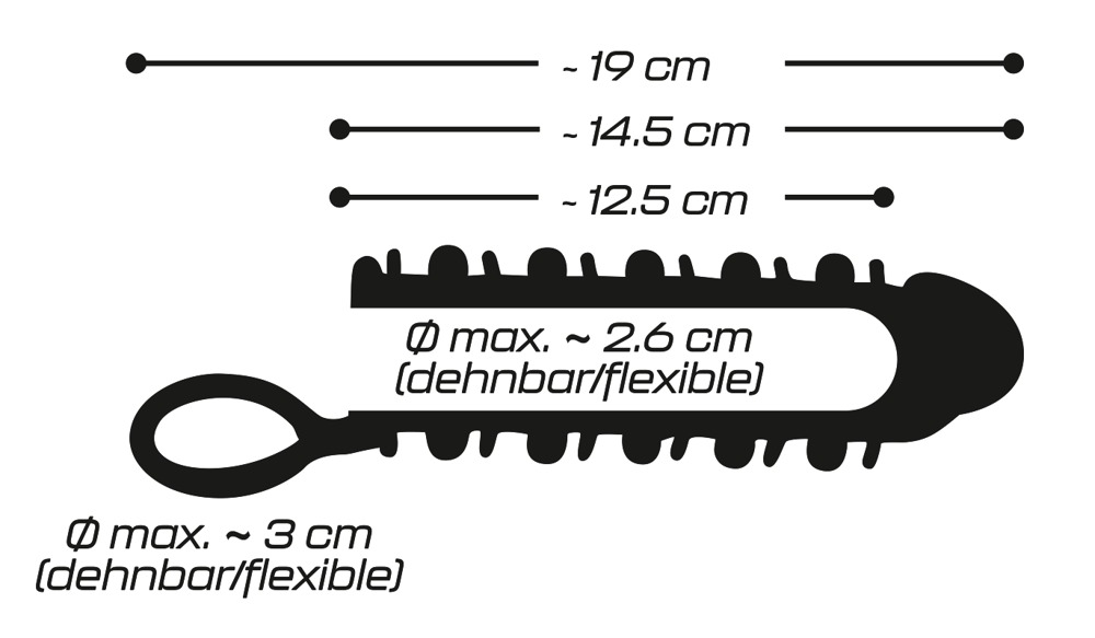 Totale lengte 19 cm, inbrenglengte 14,5 cm, inbrengdiepte 12,5 cm, sleeve Ø 2,6 cm (rekbaar), ring Ø: 3 cm (rekbaar).