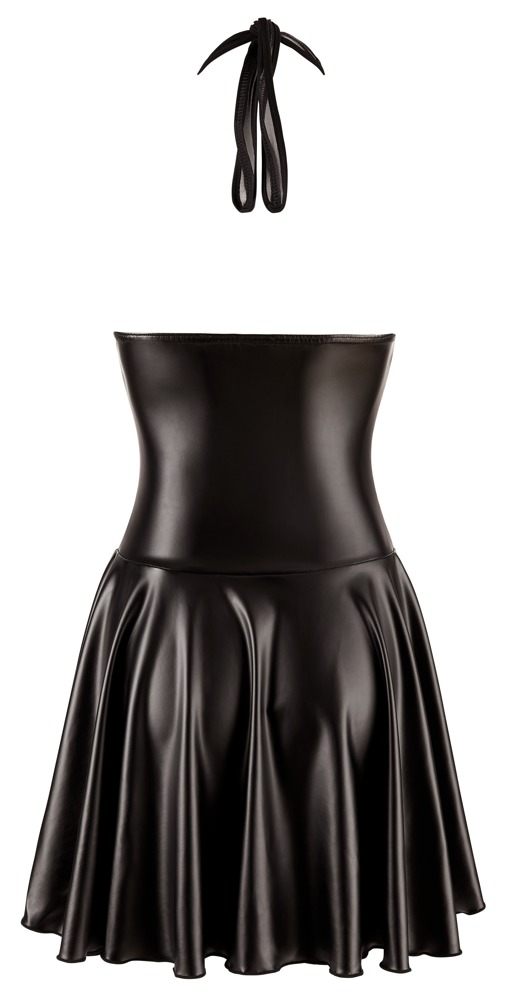 Korte Immoral Exclusive jurk van NOIR in een nauwsluitend model met uitlopende rok. In een elegante zwarte mix van zacht powernet met lakdetails (boven) en powerwetlook (rok). Met een doorlopende 2-wegritssluiting aan de voorkant vanaf de hals tot aan de zoom. Rugloos - de halternek kan gestrikt worden. De uitlopende rok is aan de voorkant iets korter dan aan de achterkant.