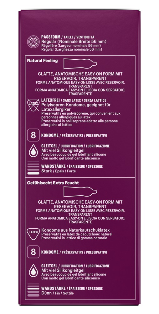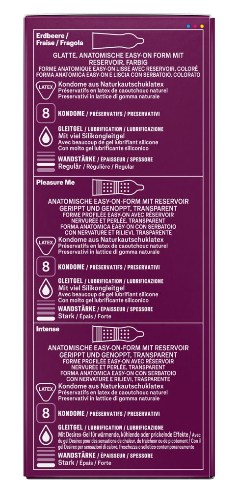 Vergeleken met conventionele cilindrische condooms biedt de innovatieve anatomische Easy-on vorm van Durex condooms iets meer ruimte op de juiste plekken, waardoor ze makkelijker aan en uit te doen zijn en zorgen voor een comfortabele pasvorm en intense sensatie.