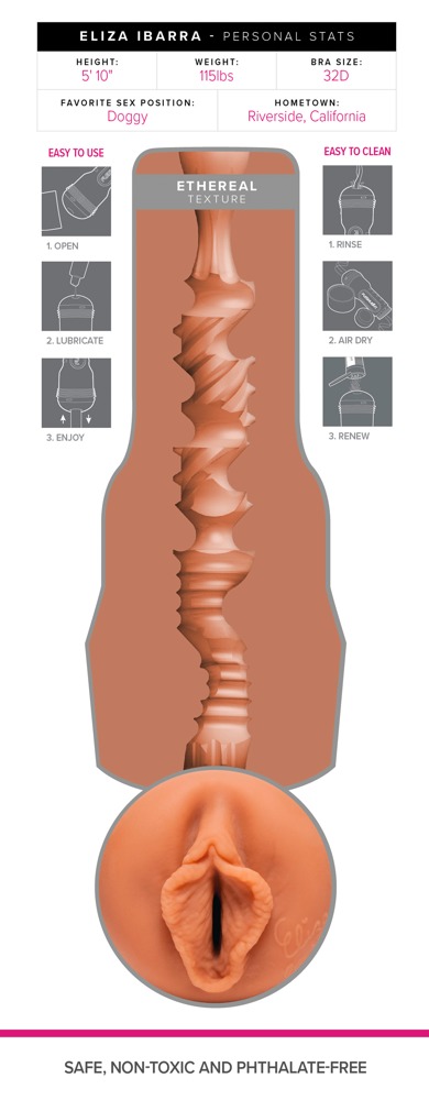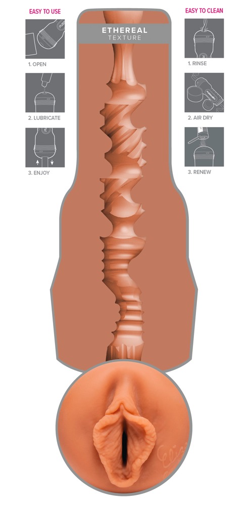 Grip masturbator Eliza Ibarra Ethereal van Fleshlight in discrete fakkellook met originele gegoten vaginaopening van erotische ster Eliza Ibarra. En ook de zeer divers gestructureerde binnensleeve met verschillende diameters komt heel dicht bij Eliza's strakke vagina en zorgt voor een intense, orgasme-effectieve massage tijdens het handjobben. De binnenhoes van huidachtig superzacht materiaal heeft Eliza's handtekening naast de opening en kan gemakkelijk uit de masturbator worden gehaald om schoon te maken