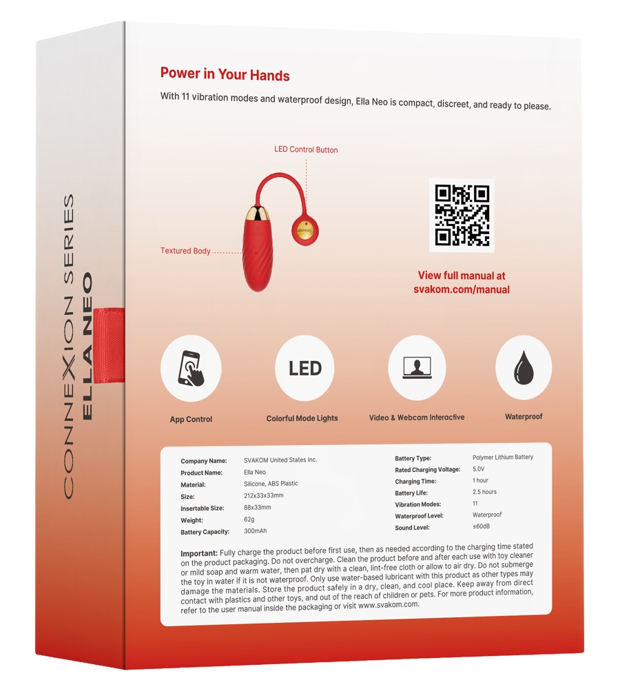 Oplaadbare, waterdichte vibro-bal voor vaginaal en anaal genot. 11 stille, gevarieerde vibratiestanden zijn handig regelbaar aan het uiteinde van de ophaalband. Ook verkrijgbaar via SVAKOM app (met extra intensiteiten en verrassingsvibraties) of FeelConnect-3 app met 3 nieuwe hoofdfuncties: Langeafstandsbediening (altijd en overal ter wereld), verbinding met interactieve 2D-video's en interactieve webcamfunctie.