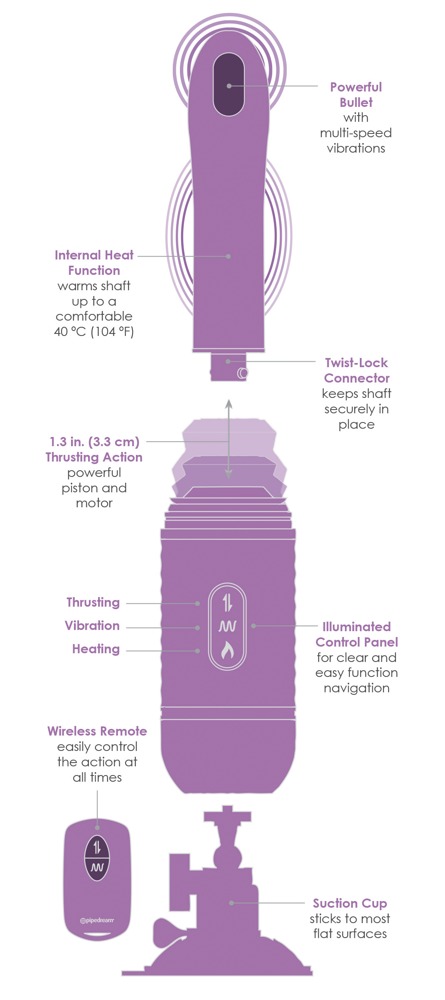 Hij verwent je echt van boven naar beneden! Met dit superspeelgoed kunt u genieten van drie spectaculair stimulerende functies: schokfunctie, vibratie- en verwarmingsfunctie. Alle drie de opties worden afzonderlijk aan de basis of eenvoudigweg met de afstandsbediening bediend. Deze en de zuigvoet maken handsfree plezier mogelijk. Na gebruik is de schacht afneembaar voor een veilige opslag.