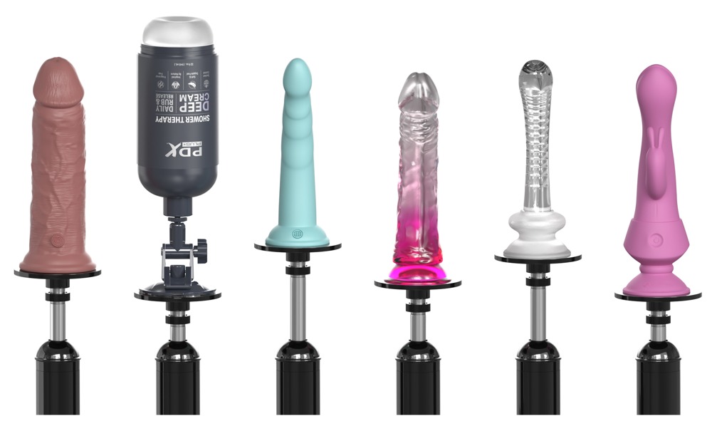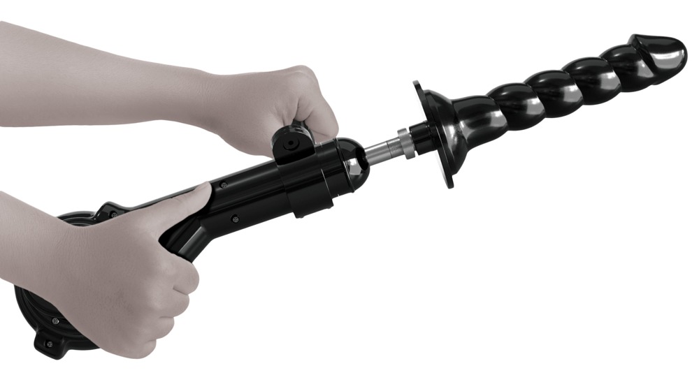 De bijgeleverde dildo heeft een zuignap die zich perfect hecht aan de gepatenteerde Push & Play-dockingplaat (Ø 8,9 cm). Dit betekent dat de gegroefde dildo snel en gemakkelijk kan worden bevestigd aan de stootarm van de seksmachine. Elk ander conventioneel zuignapspeeltje (bijv. dildo, vibrator, masturbator) kan ook gemakkelijk aan de dockingplaat worden bevestigd.