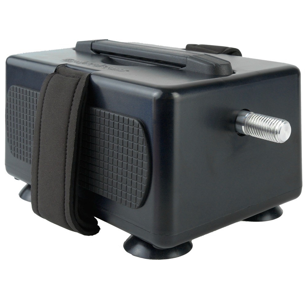 Power-operated Portable Sex Machine van Fetish Fantasy Series in handig draagbaar formaat inclusief 2 dildo's en een vibrator. De sexmachine heeft een handvat aan de bovenkant en verstelbare klittenband manchetten aan de zijkanten voor hand of voet houvast.