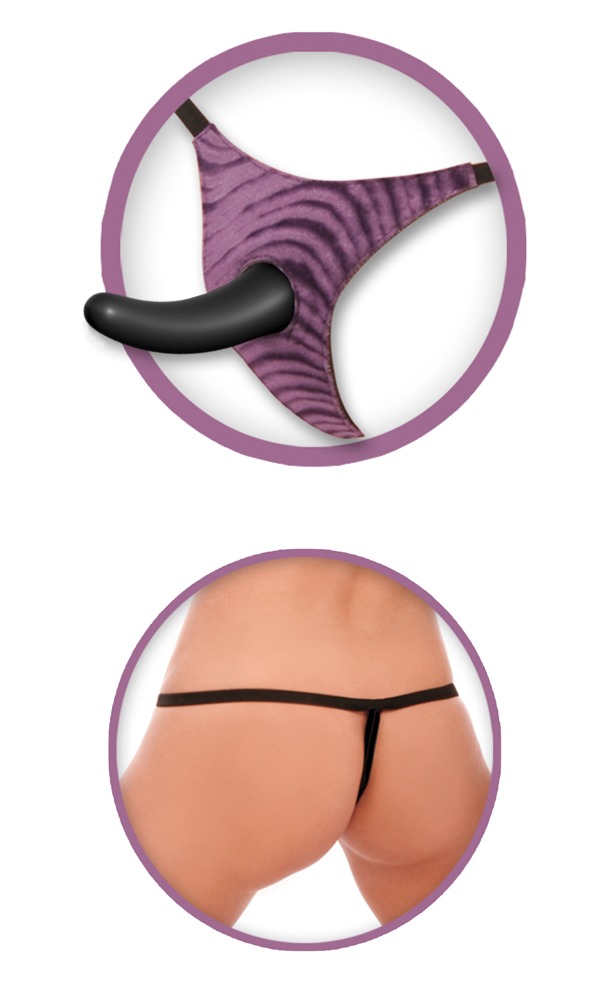 Strap-on string met verwijderbare dildo en vibrobullet voor onbeperkt pegging plezier - en ook voor het vervullen van lesbische thrusting dromen. Ideale gebogen dildo met zuigvoet en smal toelopende (P-spot) top - ook solo en zelfs handsfree speelbaar. Het is in een mum van tijd in de opening aan de voorkant van de string gestoken. De bijgeleverde vibrobullet kan ook aan de voorkant van de string worden geplaatst voor tintelende extra stimulatie. String met elastieken past in de maten S tot L. Inclusief batterijen voor de vibrobullet.