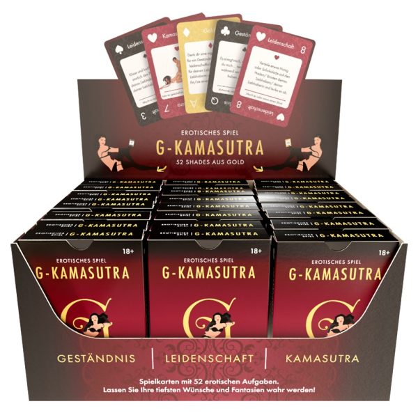 Het erotische kaartspel voor koppels G-Kamasutra - 52 Shades of Gold met zijn elegante look is de perfecte inspiratie voor intieme bekentenissen, hartstochtelijke handelingen en geraffineerde standjes. De 52 speelkaarten bieden erotische uitdagingen die plezier en sensualiteit op unieke wijze combineren. Voor spannende nieuwe plezieravonturen die elke relatie intensiveren.