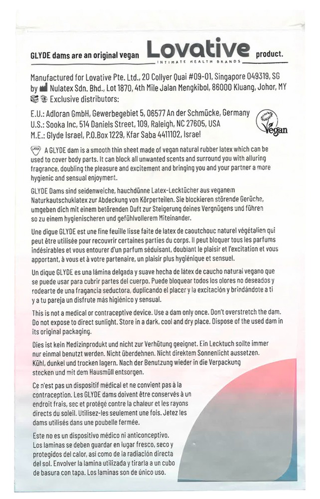 GLYDE Dams VANILLA bieden betrouwbare, hygiënische bescherming en een hoog niveau van comfort tijdens orale seks. De veganistische, crèmekleurige likdoekjes van natuurlijk rubberlatex zijn flinterdun en zijdezacht voor een sensuele, comfortabele ervaring. Met een royale afmeting van 25 x 15 cm bieden de beschermende doekjes uitgebreide dekking tijdens cunnilingus en rimmen. De subtiele vanillesmaak benadrukt het zeer speciale moment met een warme, sensuele noot. De likdoekjes zijn individueel verpakt voor maximale hygiëne en zijn snel klaar voor gebruik in de praktische, ronde doos.