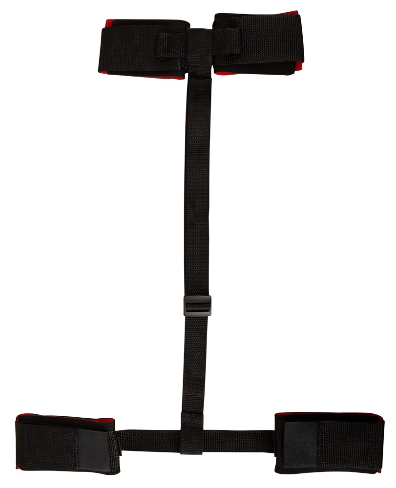 Hand- en voetboeien aan verbindingsband (lengte verstelbaar tot 80 cm). Gemaakt van scheurvast synthetisch materiaal (100% polyamide). De boeien zijn zacht gevoerd en kunnen individueel worden aangepast voor HEM en HAAR met klittenband.