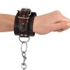 Zwarte lederlook handboeien van Bad Kitty met stiksels en kleine, uitgestanste hartjes in de signaalkleur rood. Met een praktische gespsluiting en een afneembare verbindingsketting van 15 cm (met karabijnhaken) is deze extravagante manchet ook perfect voor zeer smalle polsen - de omtrek is verstelbaar van 17-27 cm.