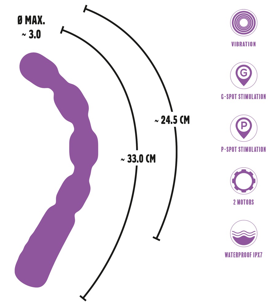 Twee motoren zorgen voor de krachtige vibraties, die vooral sterk voelbaar zijn in het uiteinde en de middelste bal. In totaal 9 vibratiestanden zorgen ervoor dat je je nooit hoeft te vervelen en kunnen gemakkelijk worden bediend met een druk op de knop van de praktische hendel. Bijzonder ingenieus is de speciale stand, waarbij de vibraties automatisch heen en weer schakelen tussen de twee motoren. Voor een intiem en verrassend samenspel van fantastische sensaties! Zelfs in bad en onder de douche, want de bullet vibrator is waterproof.