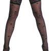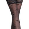 Black hold-up stockings by Cottelli LEGWARE with a delicate rose pattern. With 9 cm wide lace trim and silicone reinforcement for a non-slip fit and optimal support. Slightly pre-shaped foot. Yarn weight 20 den. Oeko-Tex certified.