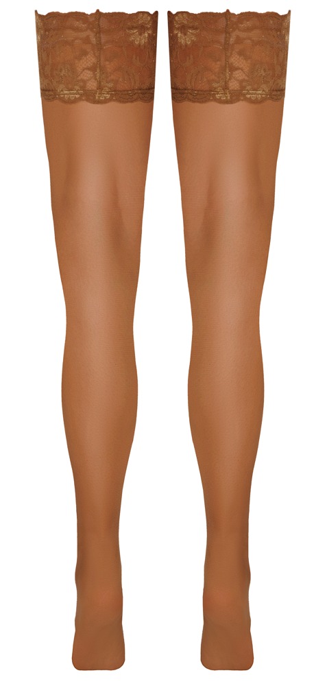 Hold-up, huidkleurige lichte kousen van Cottelli LEGWARE met mooie 9 cm brede kanten top. Binnenkant met siliconen versteviging voor een antislip pasvorm en optimale ondersteuning. Garen dikte 20 den. Oeko-Tex gecertificeerd.