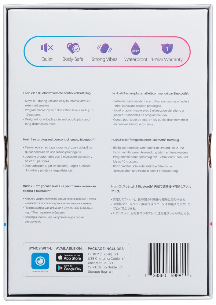 De Hush 2 vibrerende anaalplug is compatibel met de Lovense app via Bluetooth. Hier kun je zelf talloze vibratieprogramma's maken en deze gemakkelijk bedienen en opslaan via je smartphone. Zelfs vanaf je partner over lange afstanden. De Hush 2 kan zijn vibraties ook via geluid activeren en synchroniseren met muziekritmes. 7 vibratiestanden kunnen ook gemakkelijk rechtstreeks op het speeltje worden bediend met één druk op de knop.
