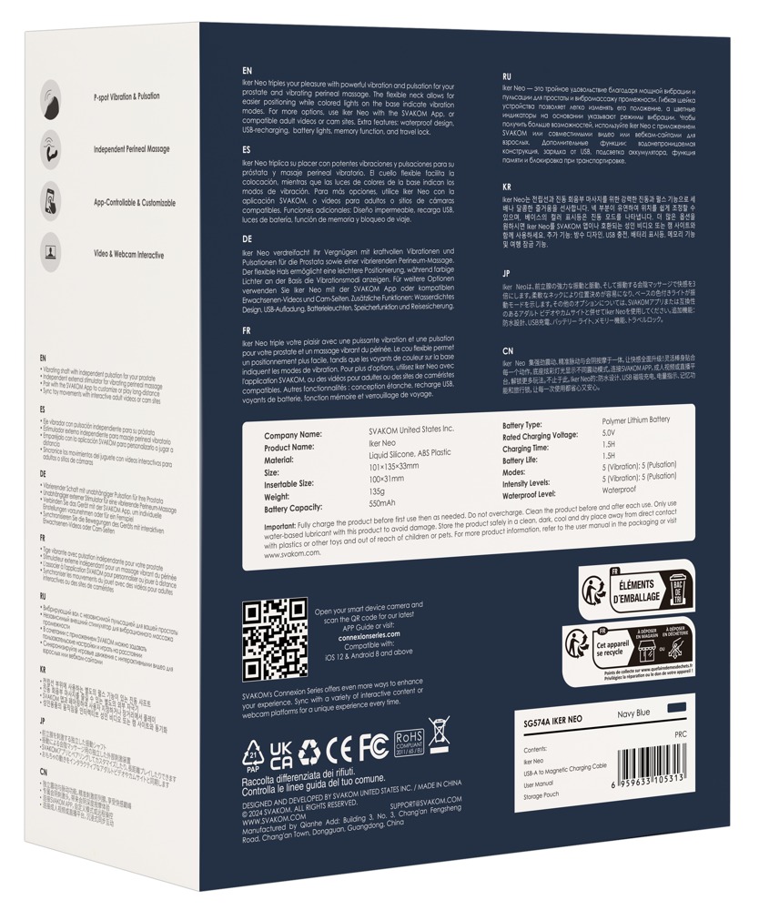 De Interactieve Pulserende Prostaat Vibrator Iker Neo van SVAKOM stimuleert de prostaat intensief met vibraties en pulsaties - en verwent ook het perineum met een vibro-massage. Ergonomisch gevormd en aangenaam flexibel, past de zijdezachte siliconen vibrator zich perfect aan het lichaam en de bewegingen aan voor maximaal comfort. De veelzijdige vibraties en P-spot pulsaties zijn eenvoudig te bedienen direct op het speeltje of via de app. Voor intens anaal plezier alleen of met z'n tweeën - zelfs in bad of onder de douche, want Iker Neo is waterproof!