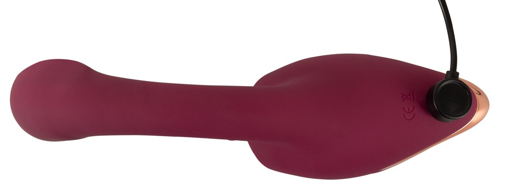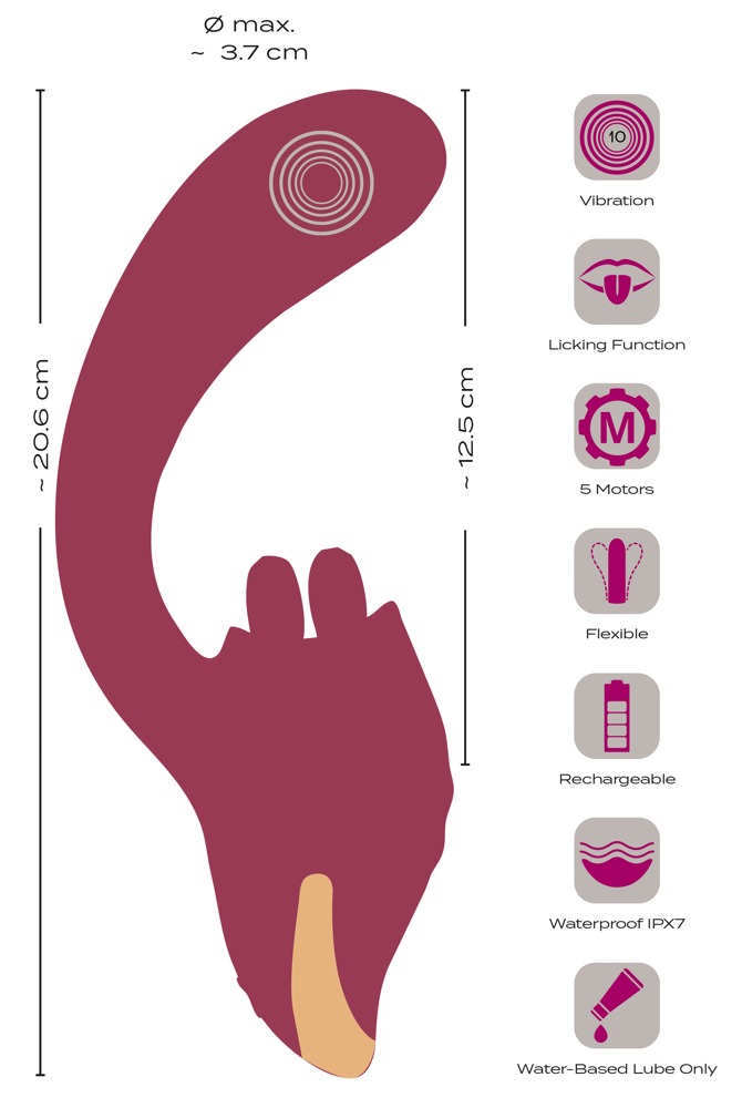 In totaal 5 krachtige motoren zorgen voor een betrouwbare en krachtige dubbele stimulatie. 10 vibratiestanden in de mollige kop van de gebogen schacht en 10 likstanden van de beweegbare dubbele tong bieden gevarieerd genot. De twee functies kunnen handig direct op het speeltje worden bediend met één druk op de knop - apart of spannend gecombineerd.