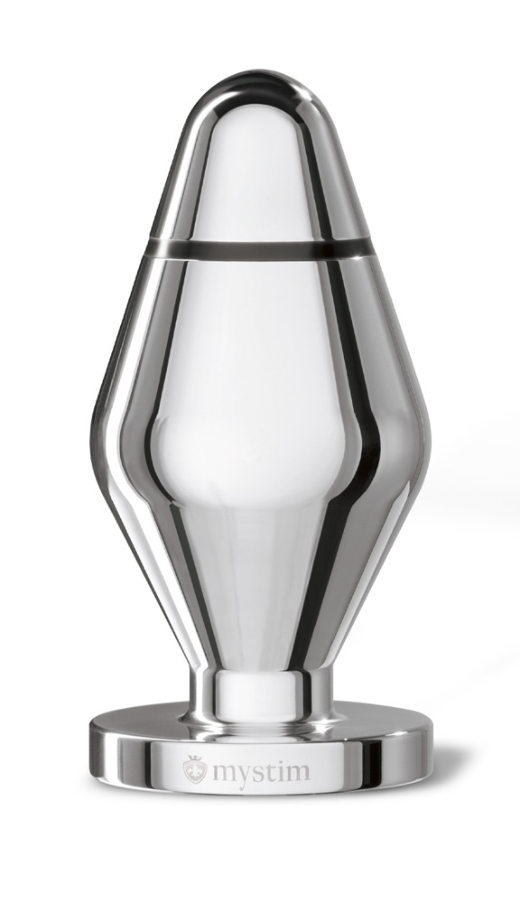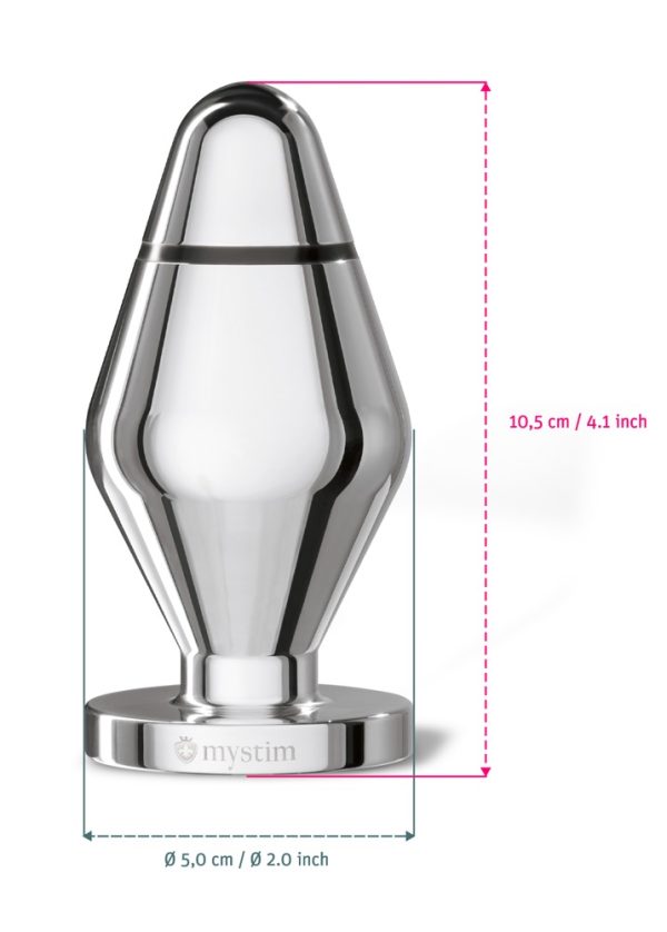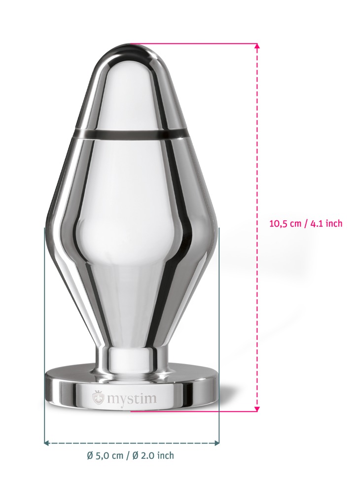 Butt Plug John van Mystim voor de Tension Lover of Pure Vibes stimulatie apparaat van Mystim. Met zijn diameter van 5 cm is de e-stim plug een ideaal anaal speeltje. Het gladde metaal loopt taps toe zodat de buttplug gemakkelijk kan worden ingebracht. Al na een paar centimeter zijn de twee polen geïsoleerd en is de elektrische stimulatie al vroeg voelbaar. Je kunt urenlang genieten van dit tintelende, wellustige genot, of de stimulatie variëren en intensiveren zodat je snel naar sensationele climaxen wordt gedreven. De metalen plug kan voor gebruik verwarmd worden op de radiator of gekoeld in de koelkast.