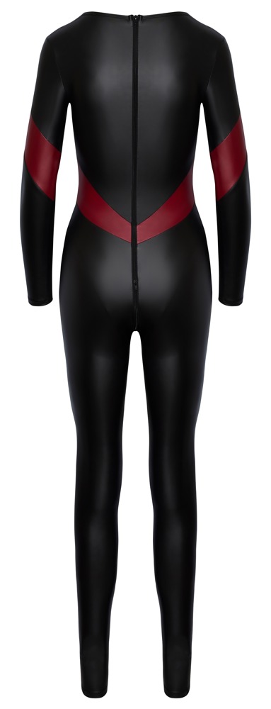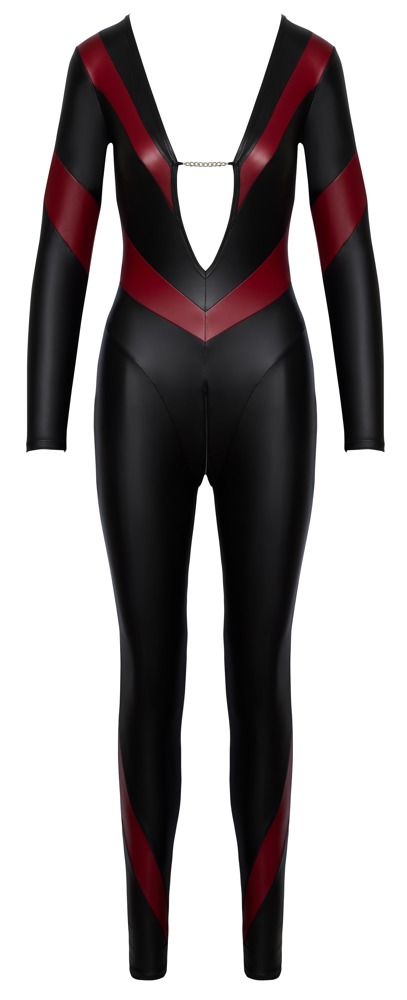 All-round elastische jumpsuit van Cottelli PARTY in zwarte matte look met contrasterende rode strepen. Dicht op de huid gesneden met lange mouwen en lange smalle pijpen. Laag uitgesneden tot op de buik aan de voorkant, houdt een zilverkleurige ketting alles mooi bij elkaar. Aan de achterkant, 3-wegs ritssluiting van de hals via het kruis naar de voorkant.