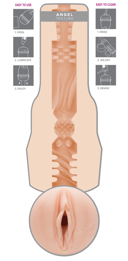 Huidkleurige masturbator met vaginaopening getrouw gereproduceerd door de erotische ster Kendra Sunderland, die deze masturbator ondertekende. Het genotskanaal met dikke noppen en stimulerende groeven brengt je in een mum van tijd naar het hoogtepunt.