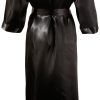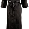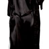Lange zwarte kimono van zacht vloeiende, glanzende satijnkwaliteit - flatteert ook het wat stevigere figuur! Met riempje. Zonder zakken.