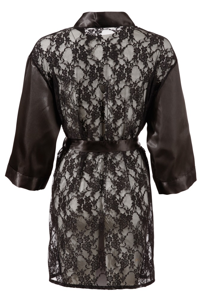 Korte kimono met mouwen, klein strikje vooraan en afneembare strikriem in de taille. Gemaakt van zijdeachtig satijn. Achteraan volledig gemaakt van semi-transparant gebloemd kant.